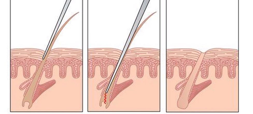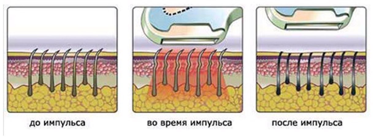 تحت تأثير الطاقة الممتصة ، يتم تسخين بصيلات الشعر ، مما يدمرها فيما بعد والأوعية التي تغذيها. يزيل الليزر الشعيرات النشطة فقط ، أي 15٪ من كل الشعيرات.