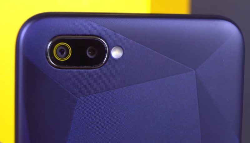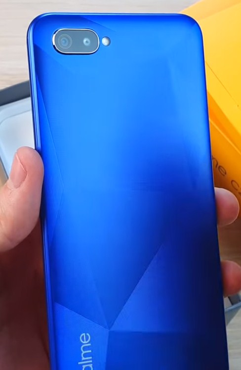 في الجزء العلوي الأيسر من اللوحة توجد وحدة محدبة قليلاً من كاميرتين رئيسيتين ومصباح LED لمصباح يدوي وفلاش. في الجزء السفلي - نقش "REALME".