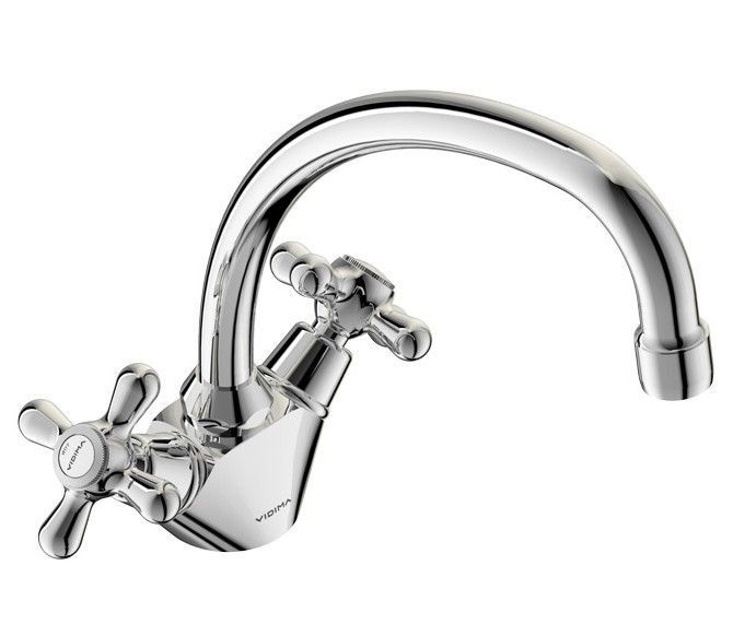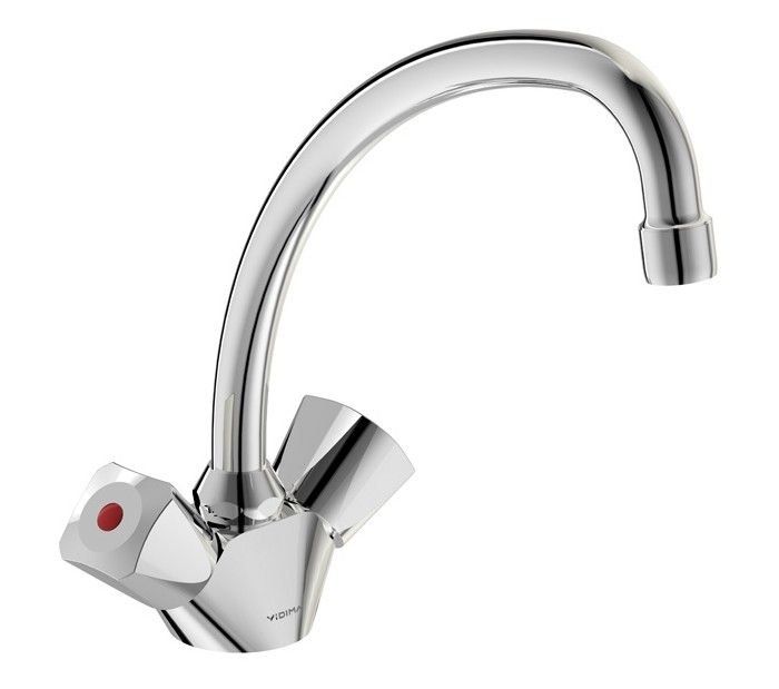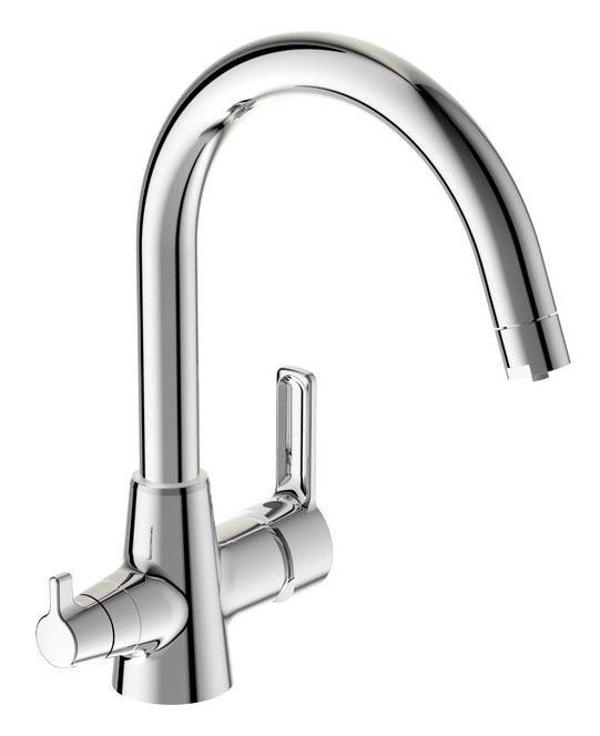 صنبور مزدوج الرافعة مع صمامات ذات شكل مناسب. تعمل فوهة التهوية على تقليل استهلاك المياه وتقليل مستويات الضوضاء. الفوهة الدوارة تجعل من السهل غسل الأطباق الكبيرة. الجسم مصنوع من النحاس المطلي بالكروم.