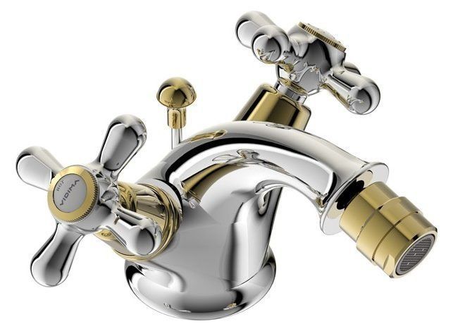 خلاط بيديت ثنائي الذراع بأسلوب رجعي بتصميم بلونين. تم تجهيز صنبور النحاس المصبوب بهواية مقاومة للتخريب. المقابض محمية من التسخين بواسطة نظام Comfort Touch.
