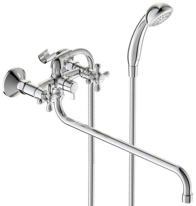 يتم تنفيذ الخلاط المريح ذو الرافعتين بأسلوب كلاسيكي. يوجد حامل إبريق الري على الخلاط. تم تجهيز رأس معقوفة الدوران بجهاز تهوية تتالي. يتم الانتقال بين أوضاع الدش يدويًا باستخدام مفتاح سيراميك. تسمح لك المقابض بضبط درجة حرارة الماء.