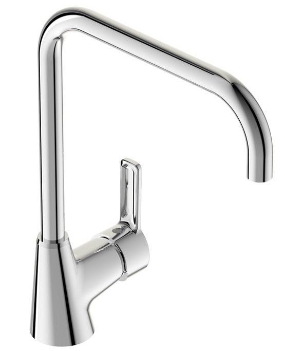 خلاط عام بمقبض واحد مع رأس معقوفة دوار طويل. النموذج مصنوع من النحاس. يمكن أن يتم تنظيف جهاز التهوية والري ذاتيًا ، مما يطيل من عمر الخدمة. هناك وظيفة للحد من تدفق المياه ، والتي ، إذا لزم الأمر ، يمكن تفكيكها.