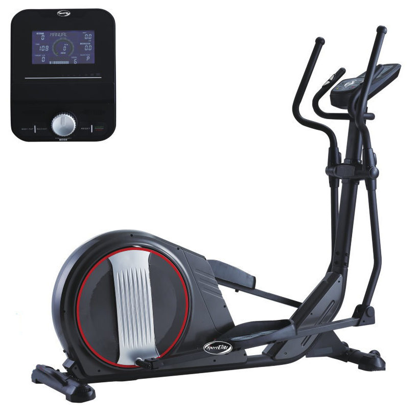 جهاز التدريب البيضاوي مزود بشاشة LCD تعرض بيانات عن الكيلومترات المقطوعة والسعرات الحرارية المحروقة والسرعة الحالية وسرعة دولاب الموازنة. يمكن تعديل زاوية المنصة للعمل بعمق على عضلات الساق.يوفر تصميم المقابض إمكانية تركيب أجهزة إضافية ، مثل مستشعر القلب ، كما تم تجهيز وحدة التحكم بحامل لجهاز لوحي أو كتاب. لمزيد من الراحة ، يتم توفير مروحة مدمجة. جهاز المحاكاة مجهز بمعوضات للأرضيات غير المستوية ، وبكرات مثبتة للنقل.