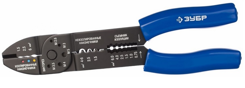 مهم! قبل القيام بأي عمل كهربائي لإصلاح التلميحات ، يجب التأكد من أن أداة العمل تطابق المواد الاستهلاكية. يمكن تجنب المشاكل المحتملة إذا كنت تستخدم مكشكشًا عالميًا به عدة تجاويف مختلفة للأكمام وقطر المقطع.