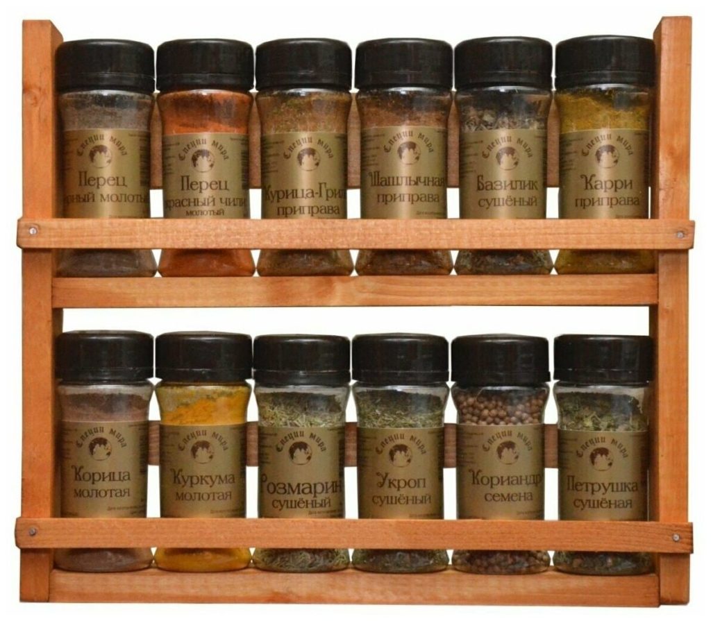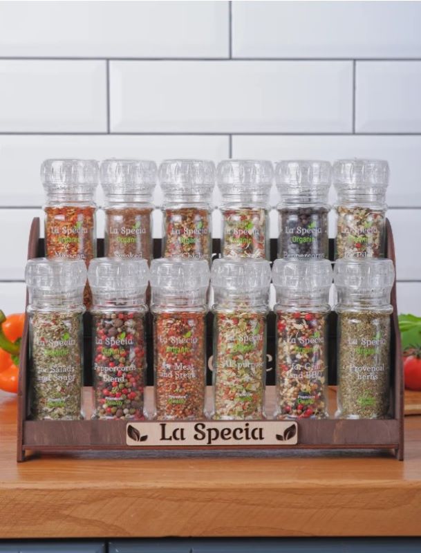 مجموعة من 12 برطمان بلاستيكي من ماركة Spices of the World ، موضوعة على رف خشبي جميل ، سوف ترضي أي ربة منزل ، ويمكن أن تكون أيضًا هدية رائعة. يتم اختيار الخلطات للأطباق الإيطالية: فلفل أحمر حار ، فلفل أسود مطحون ، قرفة مطحونة ، كاري ، شبت ، كزبرة ، خليط كباب ، بقدونس ، خليط دجاج ، ريحان ، إكليل الجبل ، كركم. بسبب الأشكال المختلفة للمعالجة (الأرض ، المطحون ، الحبوب ، إلخ) ، يختلف وزن الجرار ويتراوح من 10 إلى 50 جرامًا. الوزن الإجمالي 900 جرام.