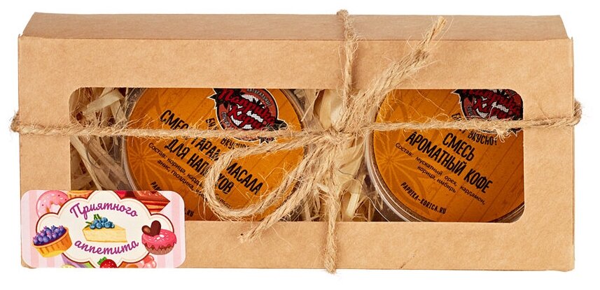هذه المجموعة مناسبة للنبيذ الكلاسيكي الساخن ، وتكمل أيضًا المشروبات الكحولية مثل الأفسنتين ، الفودكا ، المر ، الجن ، الويسكي. يوجد أيضًا في خط تجارة هذا المصنع مزيج من الحمضيات والزنجبيل. المكونات - كزبرة 20٪ ، كمون 20٪ ، شعير لؤلؤي 60٪.تباع المجموعة على شكل خليط ، في عبوة واحدة تزن 90 جرامًا ، مما يجعلها سهلة الاستخدام.