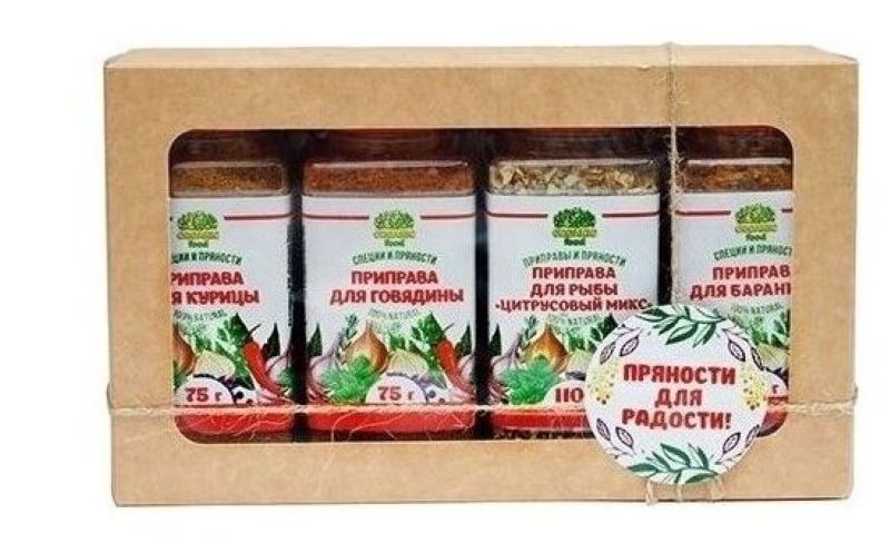 على الرغم من التكلفة المنخفضة ، فإن هذا المنتج مناسب للاستخدام اليومي ولأطباق الأعياد ، وبفضل التغليف المدروس والمثير للاهتمام ، يمكن حتى تقديمه كهدية صغيرة. يتكون من أربع برطمانات: تتبيلة للدجاج ولحم البقر والأسماك (خلطة الحمضيات) ولحم الضأن. تحتوي التركيبة على مكونات طبيعية فقط. على سبيل المثال ، يحتوي مزيج السمك على الملح والنشا وقشر البرتقال والسكر والشمر والثوم والنعناع والفلفل الأبيض. وزن الجرة الواحدة 75 جرام ، الوزن مع العبوة 330 جرام.