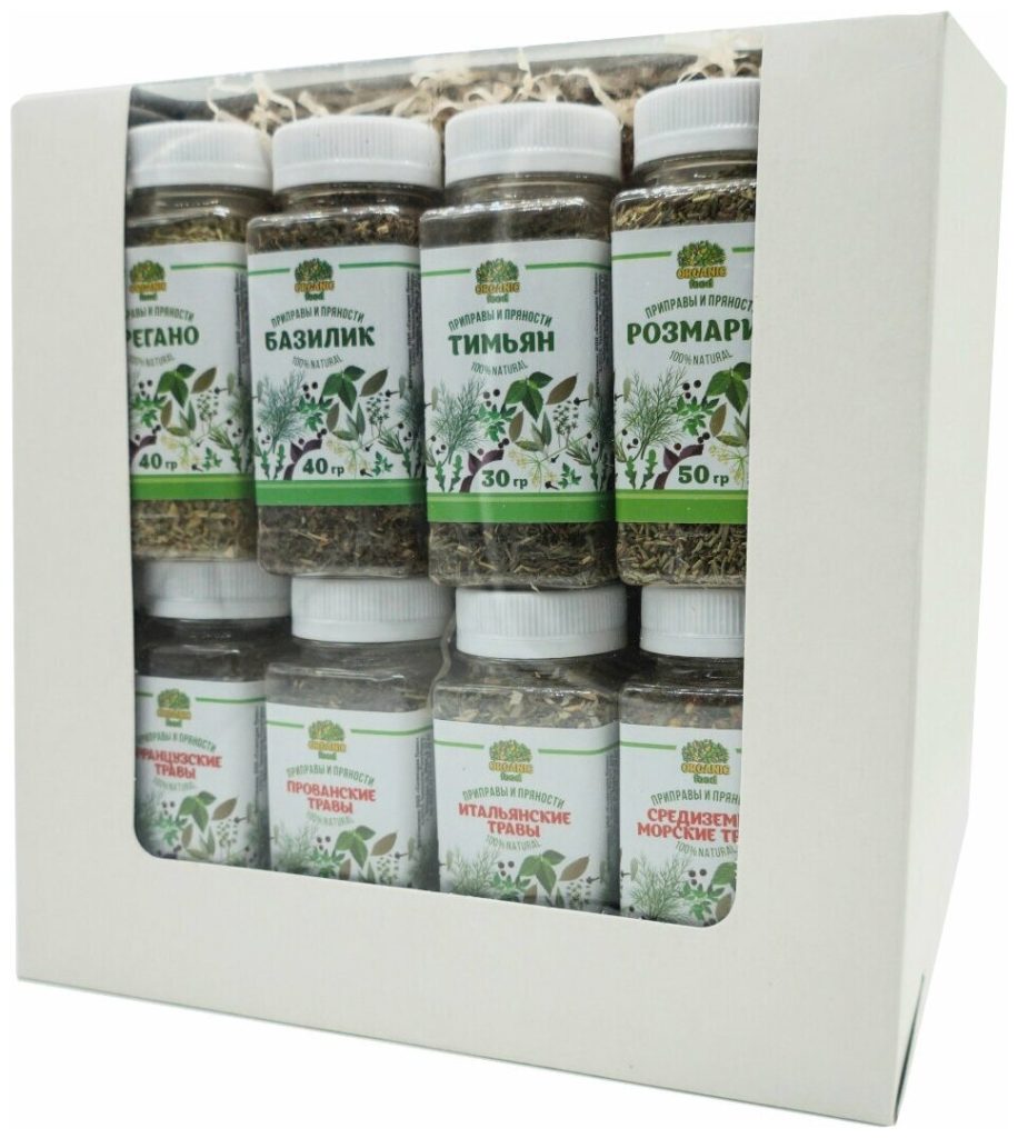 مجموعة متنوعة من المنتجات الطبيعية التي لن تكمل المطبخ الإيطالي فحسب ، بل وأيضًا أي مطبخ آخر. اعتمادًا على نوع المحتوى ، يتراوح وزن الجرة الواحدة من 30 إلى 50 جرامًا ، وهناك ثمانية في المجموعة. الوزن الإجمالي 315 جرام. في التكوين - الزعتر والريحان والزعتر وإكليل الجبل ، وكذلك الأعشاب الفرنسية والبروفنسية والإيطالية والمتوسطية.