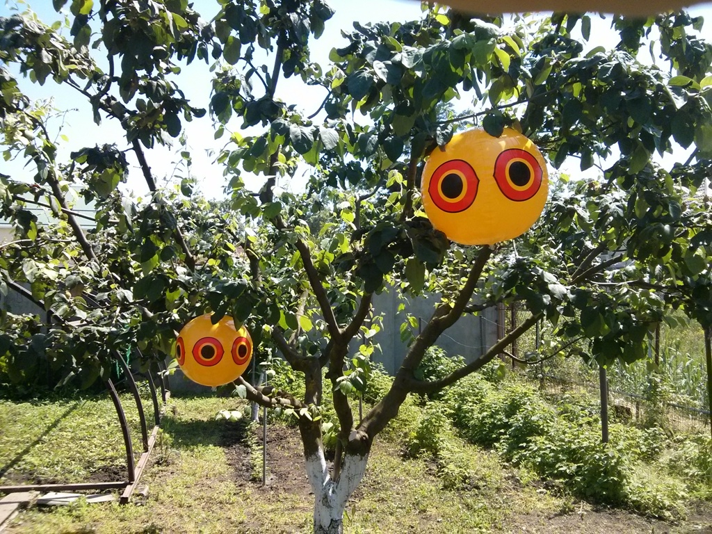 تبين أن أفضل الخيارات لإخافة الطيور هي أبسط الأدوات ، والتي من المدهش أن يكون لها تأثير فعال بشكل مثير للإعجاب. هذا الخيار عبارة عن كرة بلاستيكية عادية بنمط عين مطبق عليها. ولكن في حالة الآفات ، فإن مثل هذا المبيد البصري يعمل بشكل جيد. يتم تعليق النماذج في جميع أنحاء الموقع ، والأفضل في الأماكن التي تكثر فيها النباتات. ثم يحدث كل شيء وفقًا لمخطط واحد. يقترب الشخص المصنوع من الريش من موقع الكائن ، ويرى مفترسًا ذو عين كبيرة يحدق به ، ويقرر عدم العبث به. تلعب العيون هنا دورًا مهمًا ، حيث يخبر حجمها الطيور بالحجم التقريبي للمفترس.