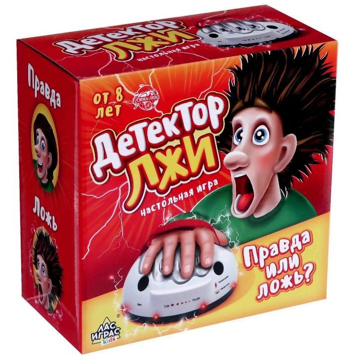 ستسعد هذه اللعبة بالتأكيد ليس فقط ولد عيد الميلاد ، ولكن أيضًا الأقران المدعوين إلى عيد ميلاده. بعد كل شيء ، ما الذي يمكن أن يكون أكثر إثارة للاهتمام بالنسبة للمراهق من معرفة أسرار الآخرين؟ اللعبة سهلة الاستخدام ، مع عدم وجود تثبيت محكم لليد ، تنطلق إشارة تحذير. يتم فك رموز الاستجابات بواسطة الجهاز كغش يصاحبها اهتزاز قوي أو صدمة كهربائية طفيفة ، ويمكن تكوين هذه الخيارات بناءً على طلب اللاعبين. يعمل على ثلاث بطاريات AA.
