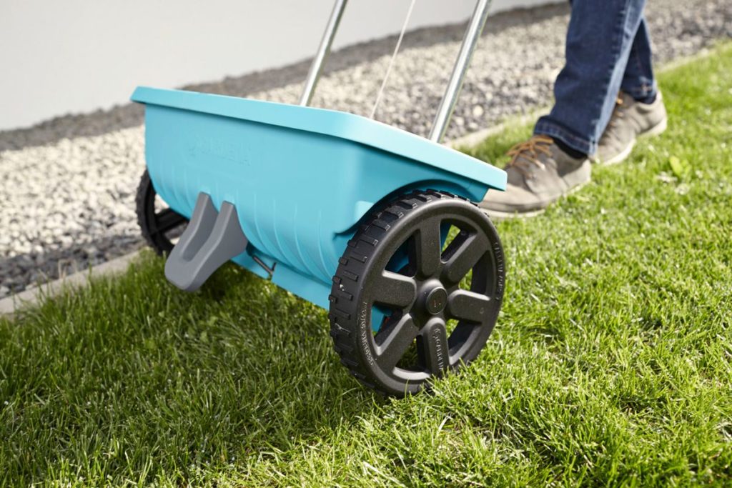 من السهل تحريك العجلات ، لذلك عند التحرك على أرض غير مستوية ، لا يتم الشعور بوزن المنتج عمليًا. اعتمادًا على نوع السماد ، يمكنك تحديد كثافة الرش.