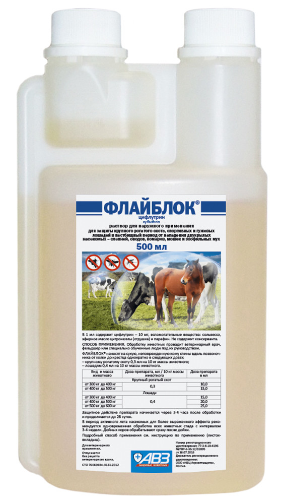 يقي الدواء من معظم الحشرات الماصة للدم. مناسبة لكل من منتج الخيول والماشية - شركة AgroVetZaschita الروسية.إنه طارد له تأثير رادع ومبيد حشري يمنع النبضات العصبية للطفيليات ، مما يسبب عدم الاتساق والشلل والموت.