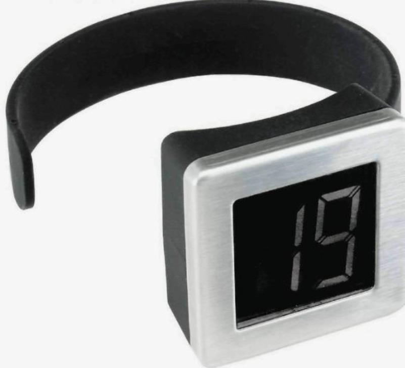 يتيح لك الجهاز الرقمي على شكل سوار مفتوح من الفولاذ المقاوم للصدأ تحديد درجة حرارة المشروب بسرعة وبدقة. الوزن - 23 جرام. الأبعاد: ٦ × ٤ × ٦ سم.