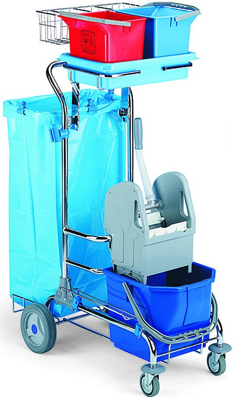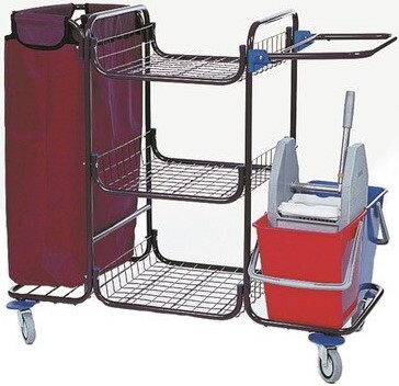 يمكن استخدام الأرفف العريضة للأشياء الصغيرة الضرورية (المناشف وأغطية السرير) ، وهي مثالية لخادمة في فندق صغير. تشتمل المجموعة على كيس نايلون كبير بسعة 135 لترًا ، ودلاء مضغوطة ميكانيكيًا (18 لترًا لكل منها) ، و 3 أرفف شبكية كبيرة. قطر العجلة: 10 سم أبعاد العربة: 59 × 104 × 118 سم التكلفة: 65278 روبل.