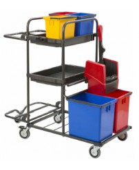 يحتوي الطراز على حزمة ممتدة ، مما يسمح لك بوضع عدد كبير من الملحقات المختلفة على المنصة. يتضمن 4 دلاء: 2 × 15 لتر ، 2 × 6 لتر. بالإضافة إلى ذلك ، يوجد درج للمنظفات في المقدمة. على الجانب مساحة صغيرة للأشياء الصغيرة. الحقيبة موجودة على المقبض ، ولا تتداخل مع الحركة. التصميم مزود بعصارة ميكانيكية يسهل نقلها بين الجرافات. العجلات قابلة للدوران وقابلة للمناورة. الوزن: 17.7 كجم. التكلفة: 32058 روبل.