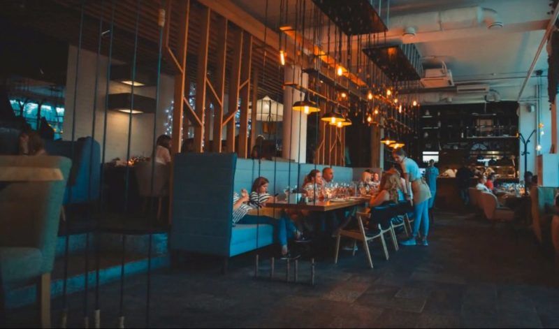 يتم إعطاء الجرأة الداخلية من خلال المصابيح والمصابيح المصممة ، المصنوعة بأشكال غير عادية وهياكل معدنية على السقف. في الوقت نفسه ، تحافظ الألوان اللطيفة للأثاث والنباتات الموضوعة حول القاعة وكذلك الشموع على الطاولات على جو هادئ وممتع.