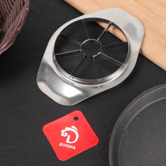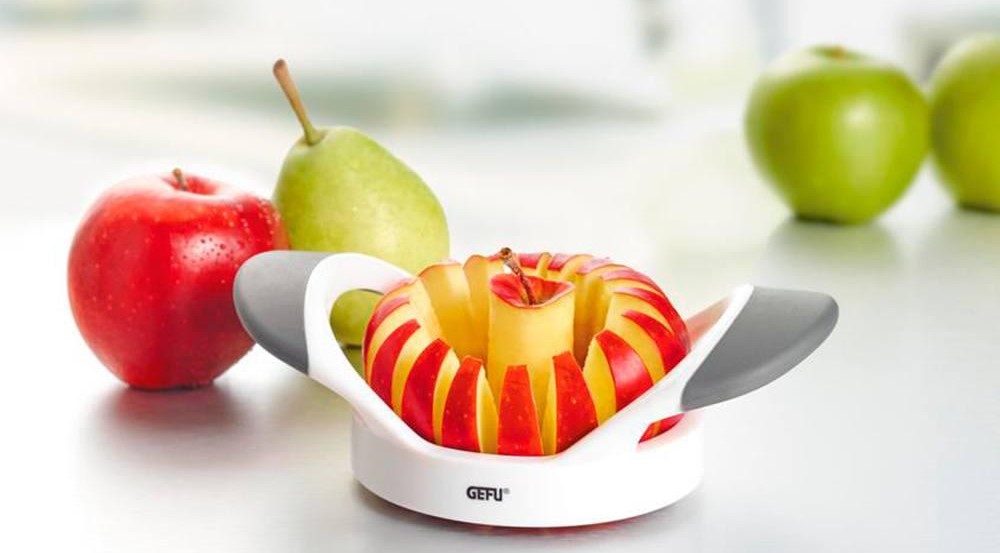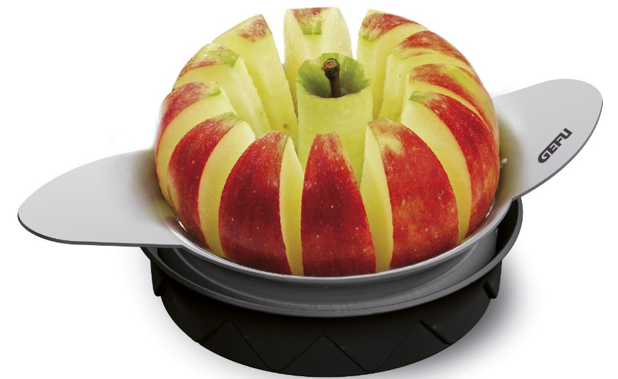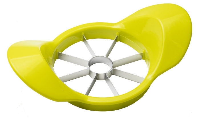 قاطع التفاح هو جهاز يمكنه معالجة كمية كبيرة من المواد الخام بسرعة وبدون عناء ، مقطعة إلى دوائر وشرائح ومكعبات (حسب نوع الفوهات). القطع متساوية وموحدة. يتيح لك هذا الجهاز إنشاء قطع جميلة بيديك أو الحصول على زخارف غير عادية من الفاكهة.
