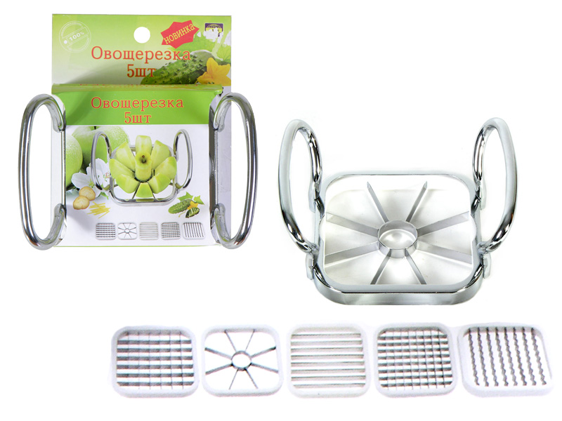 تعدد القطع يستبدل 5 أجهزة. يمكنها بسهولة التعامل مع تقطيع الشرائح والتقطيع المجعد وتقطيع التفاح باستخدام عيدان تناول الطعام والقضبان. جزء القطع له 6 حواف. تأتي المجموعة مع 5 فوهات قابلة للفك للعمل. من خلال المقابض ، يسهل الإمساك بها حتى بالنسبة للمراهق. السعر: 850 روبل.