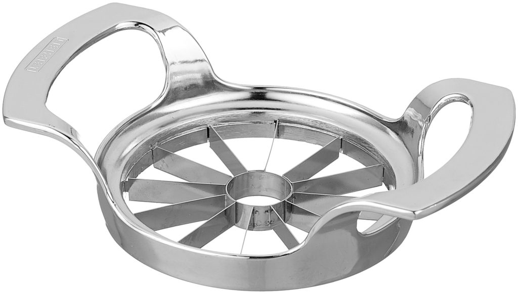 سيبدو التصميم الأصلي في المطبخ في أي مكان داخلي. يقسم الفاكهة إلى 12 جزء متساوي. الشرائح صغيرة ، ومن الملائم استخدامها للتجفيف. نظرًا للموقع الملائم للشفرة والمقابض ، فلن تحتاج إلى استخدام الكثير من القوة للعمل. المنتج سهل الغسل والتخزين ولا يتطلب عناية خاصة. الأبعاد: 16 × 10 × 5 سم ، السعر: 1242 روبل.