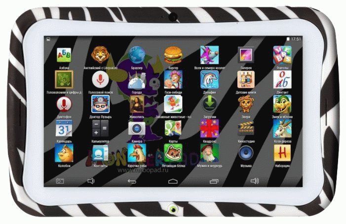 هذا نموذج للأطفال مزود بكاميرتين تسمحان لك بالتقاط الصور وتسجيل مقاطع الفيديو. الجهاز متوافق مع تنسيقات الوسائط المتعددة الشائعة ، ويحتوي أيضًا على تطبيقات تعليمية وشائعة مثبتة مسبقًا. لا يؤثر الجهاز اللوحي المزود بشاشة مقاس 7 بوصات ودقة 1024 × 600 بكسل سلبًا على رؤية الطفل ، كما أنه محمي نوعيًا من الرطوبة والأضرار الميكانيكية بواسطة طبقة واقية.