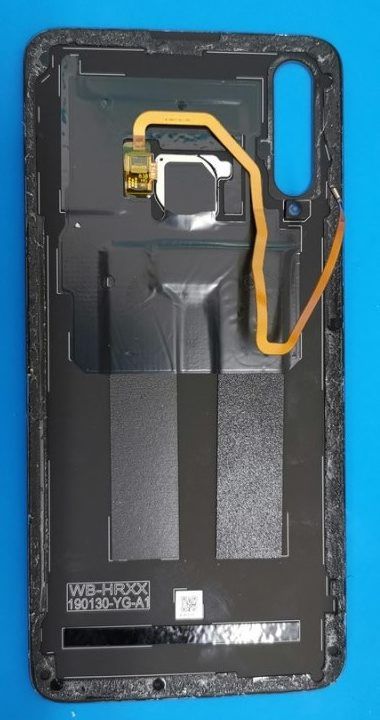 الغطاء الخلفي للهاتف الذكي مصنوع من مادة زجاجية ، يوجد عليها شعار الشركة ويوجد ماسح ضوئي على شكل دائرة يتعرف على إصبع المالك.