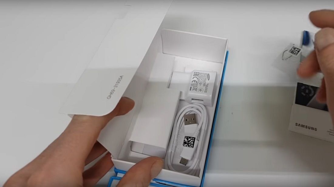 يتم تغليف الجهاز ومكوناته في صندوق كرتون سميك أزرق عادي مع شعار Samsung في الأعلى. اسم النموذج مكتوب في الوسط بخط أبيض كبير. التصميم أضيق الحدود ونموذجي للشركة. لكن شركة Apple هي التي حددت اتجاه التقليلية. على الجزء الخلفي من العبوة القوية ، يشار إلى رمز الطراز والمعلومات الإضافية من الشركة المصنعة بأحرف صغيرة.