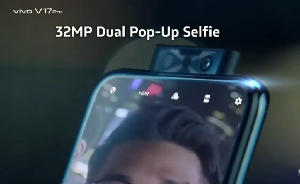 تتكون الكاميرا الأمامية المنبثقة Vivo V17 Pro من عدسة رئيسية بدقة 32 ميجابكسل بفتحة f / 2.0 وعدسة ثانية بفتحة 8 ميجابكسل f / 2.2. ميزة لافتة للنظر هي لوحة الكاميرا المزدوجة المنبثقة ، وهي جديدة في سلسلة V.