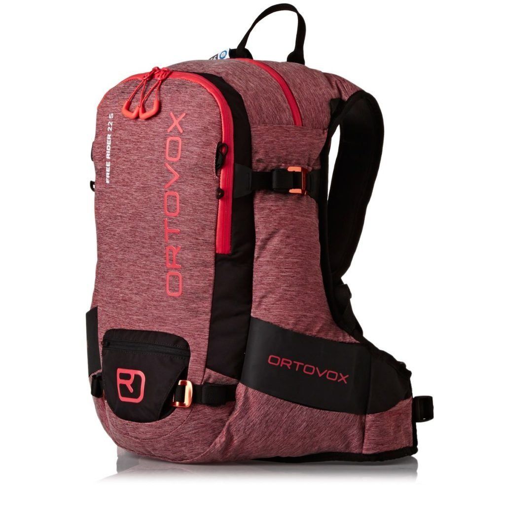 Ortovox Free Rider 22 S je prostorný model vhodný pro osoby s výškou 150-175 cm (označení S). Batoh má ergonomická záda SPS Flex, která přebírá hlavní zátěž a odlehčuje zádům, ramenům a pánvi sportovce. Tvar poskytuje volnost pohybu a rychlou reakci v extrémních situacích. K dispozici je vodovodní systém bez nádrže (prodává se samostatně). Hrudní popruh je opatřen fastex zapínáním, popruhy jsou nastavitelné.Model má vnější držáky na lyže, hůlky, ledoborec, síť na helmu. Na hrudním popruhu je připevněna píšťalka. Je zde několik přihrádek: hlavní, na drobnosti, na lavinové vybavení. Látka je impregnována vodoodpudivým složením a vyrobena ze 100% nylonu. 5. místo v žebříčku nejlepších.