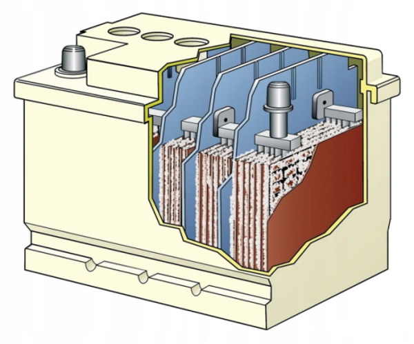 Konvenční 12V baterie (AC) je sada samostatných 2V plechovek, sestavených v jednom pouzdře a vzájemně propojených sériovým způsobem.