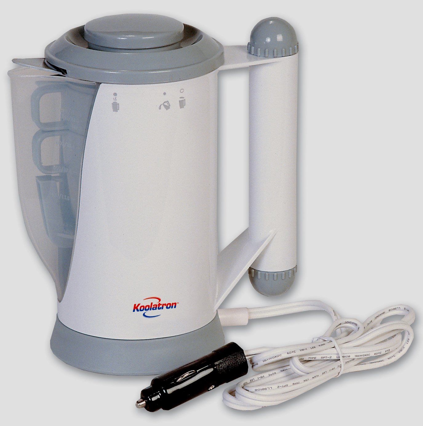 Produkt kupují motoristé, kteří jsou zvyklí neustále „bydlet“ ve vlastním autě, jezdit na služební cesty, vozit rodinu na dovolenou nebo cestovat na atraktivní místa. Objem 700 ml stačí k zajištění vařící vody pro pět osob. Funguje z cigaretového zapalovače 12 V. Spotřebovává 7,5 A proudu. Při výrobě modelu je použit tepelně odolný plast. Sada je velmi pohodlná a skládá se ze dvou šálků, upevnění na obložení dveří, plastové lžíce, síťky na vaření, speciálního stojanu, který vám umožní ohřívat dětskou stravu, a pohodlné vidličky. Uvnitř konvice lze umístit vše, kromě držáku. Parametry zařízení - 19,5 * 11 * 17 cm.Produkty vyrábí kanadská společnost Koolatron.