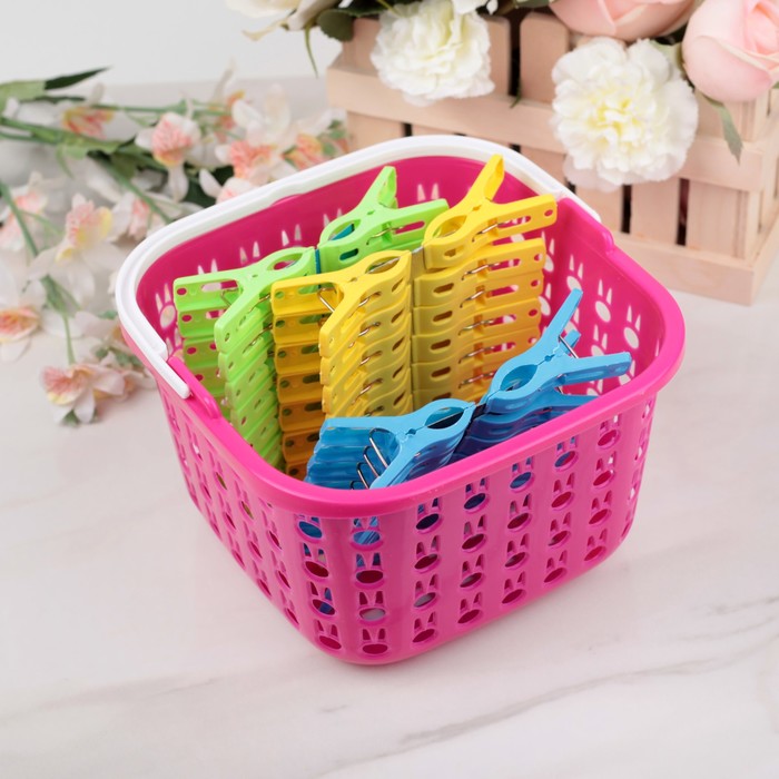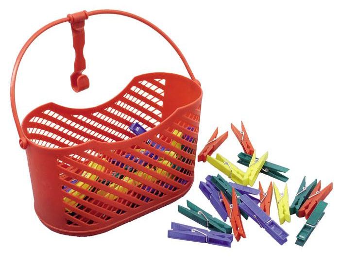 Sada se skládá z košíku a 24 barevných kolíčků na prádlo vyrobených z odolného plastu. Proto bude výrobek sloužit po dlouhou dobu, aniž by ztratil svůj účel a vzhled. Model má dobrou kapacitu. Je také nutné poznamenat přítomnost pohodlné rukojeti a háčku pro přenášení.Takové dodatečné příslušenství vám umožní současně pověsit oblečení a držet produkt v rukou nebo jej zavěsit na lněnou šňůru. Na jedné straně má konstrukce speciální otvory pro cirkulaci vzduchu. Model má stylový vzhled a univerzální použití.