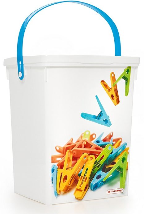 Univerzální model je ideální pro uložení kolíčků na prádlo a dalších drobností v domácnosti. Pohodlný obdélníkový tvar umožňuje pohodlné umístění designu na jakýkoli povrch. Praktické otvory pro ruce pomáhají posunout konstrukci správným směrem. Plast je odolný a ani při pádu se nepoškodí, takže design vydrží dlouhou dobu.
