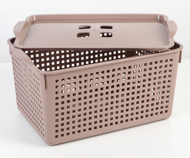 Obdélníková nádoba je kryta plastovým víkem. Designovým prvkem je dobrá kapacita a přítomnost štěrbin na víku pro cirkulaci vzduchu. Malá madla umožňují přenášení košíku správným směrem. Je třeba také poznamenat, že nádoba je vybavena speciálními bočnicemi, takže můžete uložit více košů naskládaných na sebe současně.