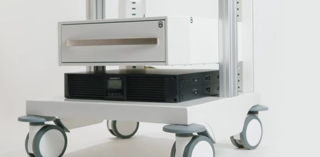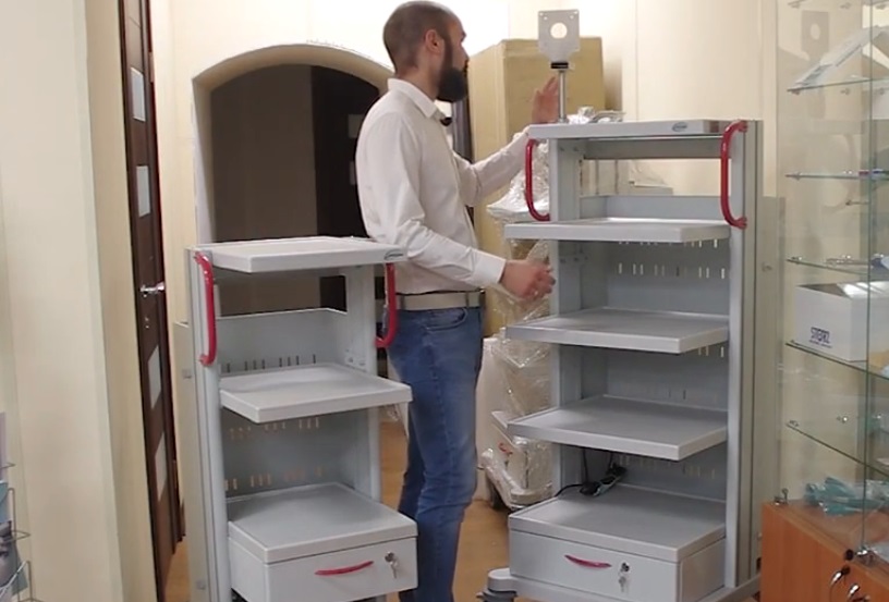 Na tento stojan můžete umístit monitor a další vybavení, které lékař potřebuje. Nepřerušitelné napájení je považováno za vlastnost. Nosnost je 100 kg. K přepravě slouží 4 kolečka. Přípustná úroveň zátěže - 900 W.