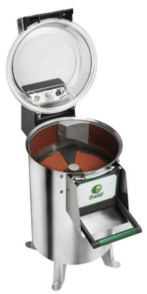 Další italská škrabka na brambory, která se vyznačovala svými parametry a kvalitami.Stejně jako předchozí modely dokáže oloupat nejen brambory, ale i jiné kořenové plodiny. Je možné se napojit na vodovod. Stroj je vyroben z nerezové oceli, deska, která čistí okopaniny, se skládá ze silikonu a hliníku. Nahoře je okno ze skla, aby člověk mohl celý proces sledovat a případně upravit. Hodnocení je obecně dobré, kupující jsou s tímto produktem spokojeni. Důraz je kladen na produktivitu, kvalitu materiálu a zpracování.