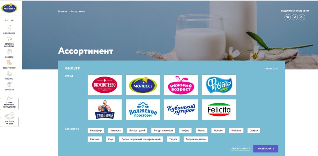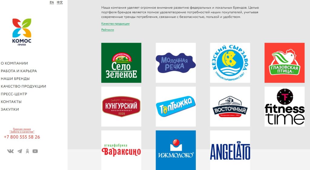 Vyrábí zboží osmi značek: Vkusnoteevo (2000), Felicita, Fruate, Kuban farm, Tender age, Molvest, Volga open spaces, Ivan Poddubny.