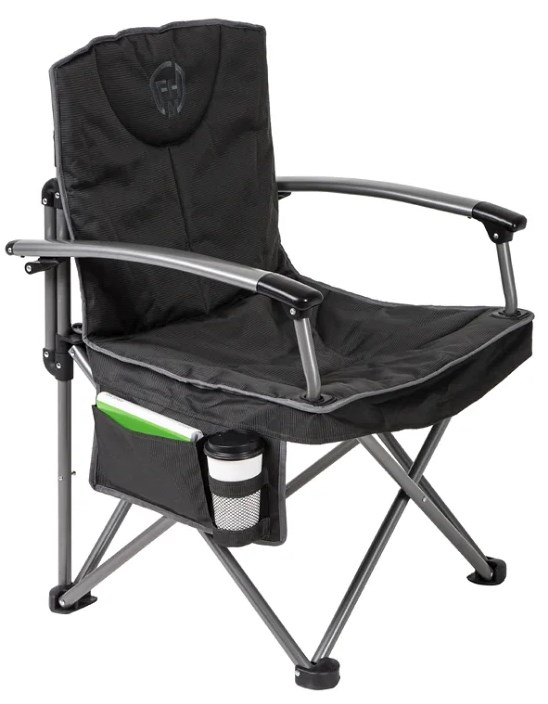 FHM 000040-0003 je monumentální design, který odolá velké hmotnosti a má dobré technické vlastnosti. Maximální zatížení pro něj je 135 kg. To je možné díky promyšlené a kvalitně smontované základně z ocelových trubek o průřezu 22 mm. Křeslo má navíc poměrně velké rozměry: celková výška - 94 cm, šířka sedáku - 62 cm, hloubka - 67 cm, výška - 46 cm.Takto prostorné křeslo bude vyhovovat i velmi velkému outdoorovému nadšenci. Je důležité si uvědomit, že sedadlo je vyrobeno s měkkou výplní, která poskytuje sedící osobě další pohodlí. Na boku pravé loketní opěrky je látková kapsa na drobnosti a držák na pohár.