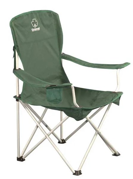Další skvělá kempingová židle od Green Glade, ale tentokrát s polohovacím stolkem na pravé područce. Má stále stejně spolehlivou a pevnou konstrukci z ocelových trubek o průřezu 22 mm. Výrobek se díky tomu samozřejmě ukazuje jako poměrně těžký (5,45 kg), ale ani při silném poryvu větru se nepřevrátí a odolá osobě o hmotnosti až 120 kg. Vysoká opora zad a široký sedák umožňují pohodlný odpočinek. Skládací stolek s držákem na šálky vám umožní mít u sebe ty nejnutnější věci.