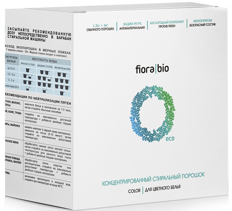 Koncentrovaný prášek si dobře poradí s každodenní špínou i starými skvrnami. Poskytuje dlouhotrvající svěžest prádla.Sada obsahuje odměrku, která vám umožní používat produkt co nejhospodárněji. Balení je kartonové, ekologické. Průměrná cena: 799 rublů.