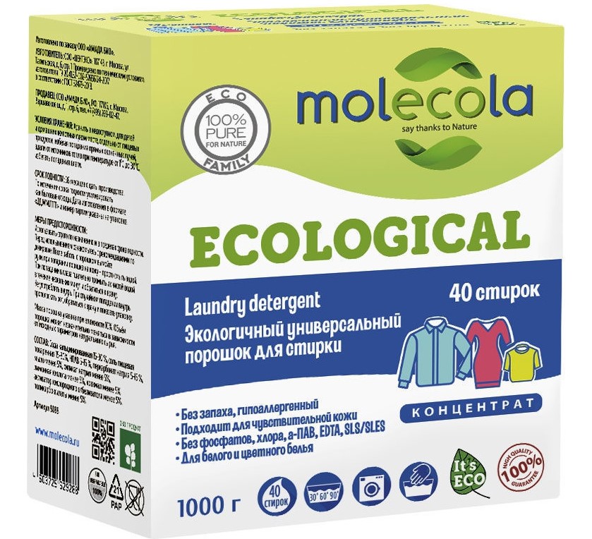 Molecola vytvořila koncentrovaný prášek vše v jednom, který poskytuje maximální účinek s minimálním množstvím produktu. Sada obsahuje odměrku, která vám umožní využít prášek co nejefektivněji. Nevyžaduje další použití klimatizace. Výrobce: Euroasijská mýdlová společnost. Cena: 308 rublů.
