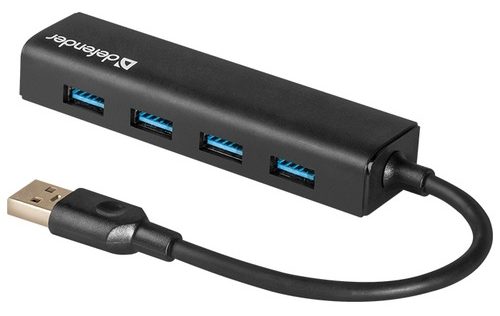 Pasivní štípačka Defender Quadro Express je vyrobena v klasické černé barvě. Pro uživatele jsou k dispozici čtyři porty USB 3.0, které jsou schopny přenášet data vysokou rychlostí - až 5 Gb/s. Proud na port je 900 mA.