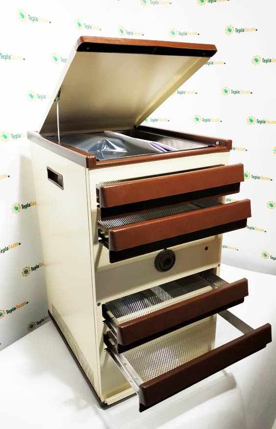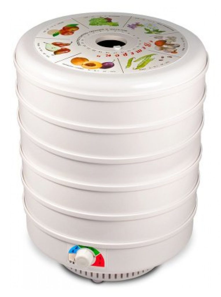 Fuldt metalmodel af indenlandsk produktion, refererer til infrarøde dehydratorer. Den massive krop med 4 paller vejer 14 kg.Effekten af en sådan enhed er 800 W, hvilket sikrer effektiv behandling af 4 kg produkter i en session. "Dachnik-4" styres mekanisk. Den manuelle temperaturregulator giver dig mulighed for at indstille den nødvendige nøjagtige værdi fra 40°C til 70°C. Den maksimale værdi gør det muligt ikke kun at tørre produkter, men også at tilberede forskellige retter fra dem. Mekanismen er udstyret med en tændt indikator.