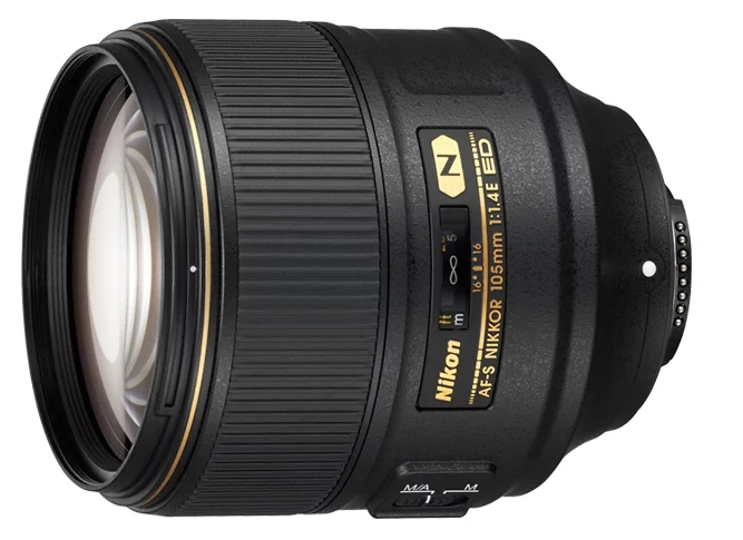 "AF-S Nikkor 105mm f/1.4E ED" eksternt objektivdesign