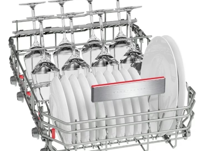 Designet har et udtrækkeligt øvre rum til glas, glas og bestik, lågen er udstyret med en Comfort Close lukker, hvormed det er muligt at fiksere den i den ønskede position.Smart elektronik hjælper med at styre, det er muligt at spore operationer på displaypanelet. Forsinket startfunktion i 24 timer, den resterende tid indtil start vises af indikatoren.