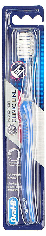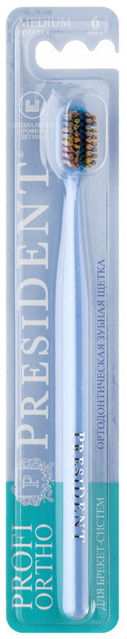 Ortodontisk tandbørste designet til professionel mundpleje og hygiejne, rengøringsbøjler, aftagelige og ikke-aftagelige strukturer. Børsterne har et gennemsnitligt stivhedsniveau, hvilket giver dig mulighed for omhyggeligt at pleje protesen, tænderne og tandkødet. Den midterste række af børstehår er forkortet for mere effektiv rensning, børsterne er tætte, pænt afrundede.Produkthåndtag med ergonomisk design og kompakt børstehoved. Fås i blå og hvide farver.