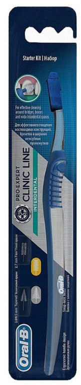 Interdental sæt bestående af to børster - konisk (6,5 mm) og lige (2,7 mm). Ideel til rengøring af seler, proteser, broer. Produktets ergonomiske håndtag giver behagelig brug takket være gummiindsatser med en ribbet overflade, og børstehovedet er udstyret med en pålidelig låselås. Vinklen på børsten kan ændres til 180 grader og renser nemt fjerne områder i mundhulen, strukturer og mellemrum. Sættet indeholder en konisk børste til brede rum og en lige, cylindrisk børste til smalle mellemrum. Fås i blå.