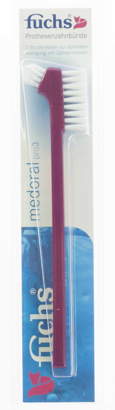 Model af en tandbørste fra en tysk producent, udstyret med to typer børster. På den ene side har produktets hoved lange og lige børstehår designet til at rense de lige overflader af ortodontiske strukturer. Den anden side er udstyret med skrå børstehår, der renser ujævnheder, bøjninger, fordybninger på indersiden af proteserne. Formen på produktet giver dig mulighed for at pleje fjerne områder og zoner i mundhulen og fjerne bakteriel plak. Fås i to farver - rød og blå.
