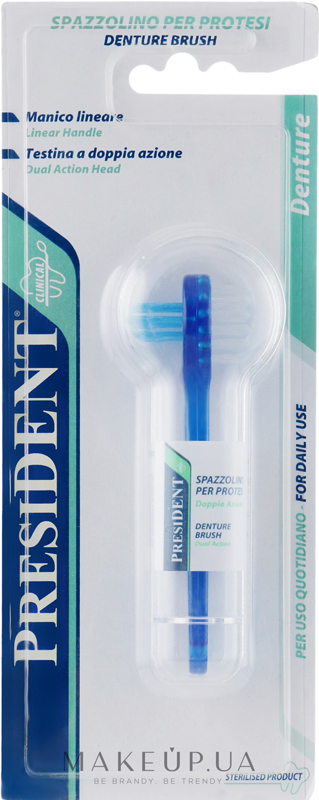 Professionel model af en tandbørste til proteser fra en italiensk producent. Produktet er designet under hensyntagen til enhedens funktioner, form og materialer af tandstrukturer. President-børsten renser indersiden af strukturen og svært tilgængelige hjørner med aflange lige og hårde børster. Korte børster med en medium stivhed, placeret på den anden side af hovedet, er designet til forsigtigt at rense den ydre, glattere side af protesen. Produktet er blevet steriliseret under emballering. Sættet indeholder et særligt etui til individuel opbevaring og beskyttelse mod ekstern forurening. Farve - smaragdgrøn.