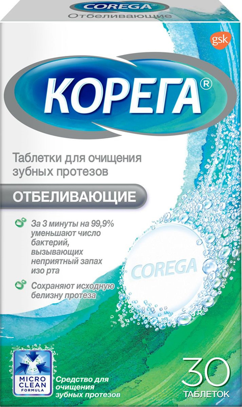 Daglig plejeprodukt til proteser, der fjerner plak og opfrisker munden. Corega giver en dybderens uden behov for at lade protesen ligge natten over i opløsning - på tre minutter fjerner dette produkt bakterier, der forårsager lugt, plak og pletter. Som et resultat bliver protesen ren og frisk. Denne form for rengøring af tandstrukturer ridser ikke overfladen, fordi den i modsætning til almindelig tandpasta ikke indeholder slibende stoffer.