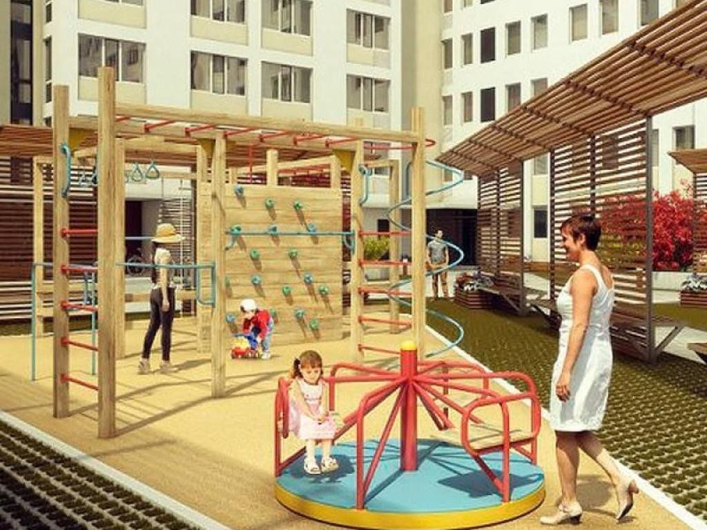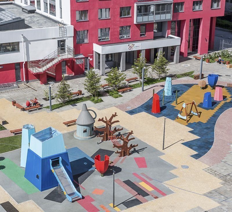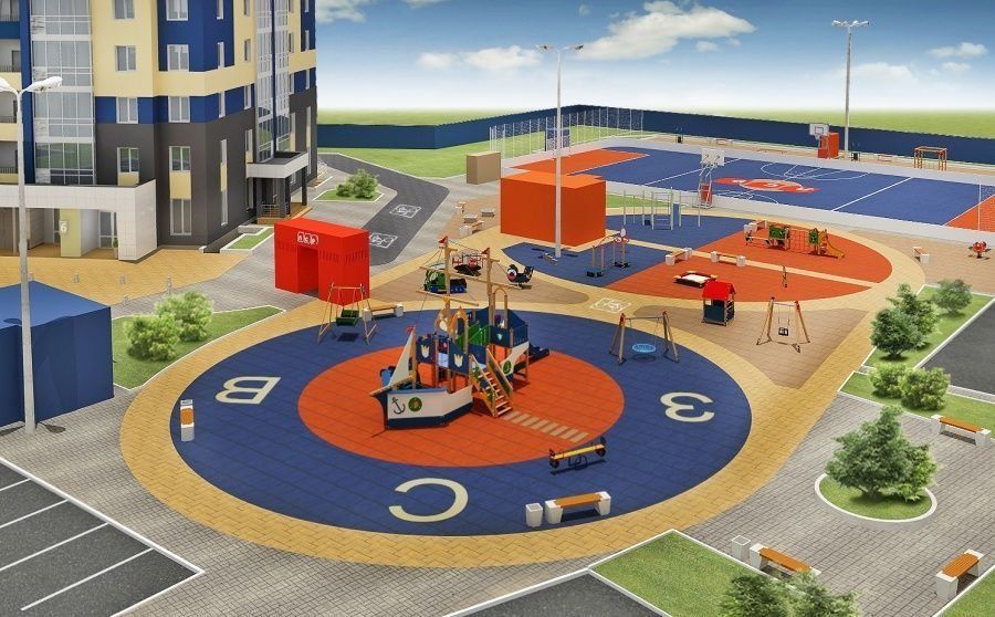 Der Kinderkomplex ist mit einer speziellen Beschichtung versehen und verfügt über viele Schaukeln, Klettergerüste, Rutschen, Sandkästen und Trampoline. Der Sportbereich hat eine Beschichtung, die auch bei Regenwetter trocken und angenehm bleibt. Das Gebiet ist sonnig und groß genug 8000 m2. Landschaftsgestaltung in Form von jungen Apfelbäumen, Birnen und Tannen mit begehbaren Alleen. Es gibt keine Parkplätze in der Nähe des Geländes, sodass sich Kinder sicher im gesamten Gebiet bewegen können. Im Dunkeln wird er von hohen Laternen beleuchtet, die Wege werden ebenfalls durch Illumination erhellt. Das Gebiet wird rund um die Uhr videoüberwacht.